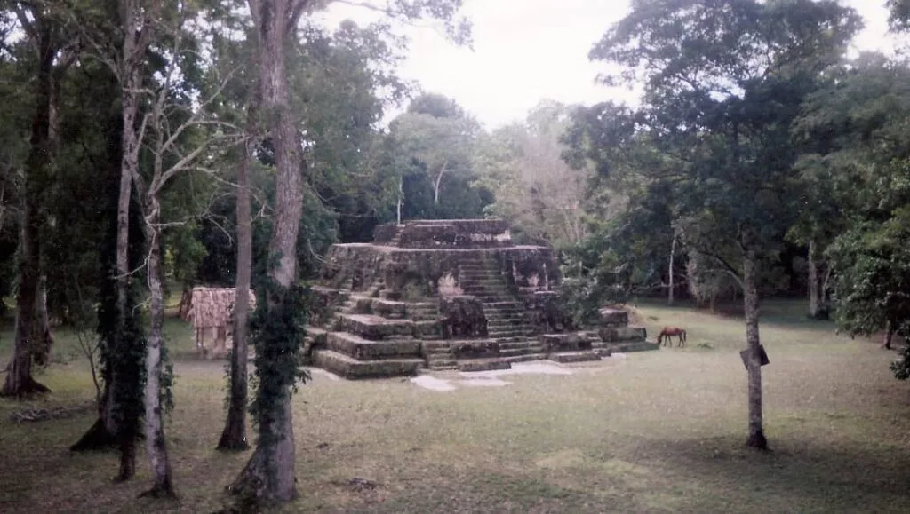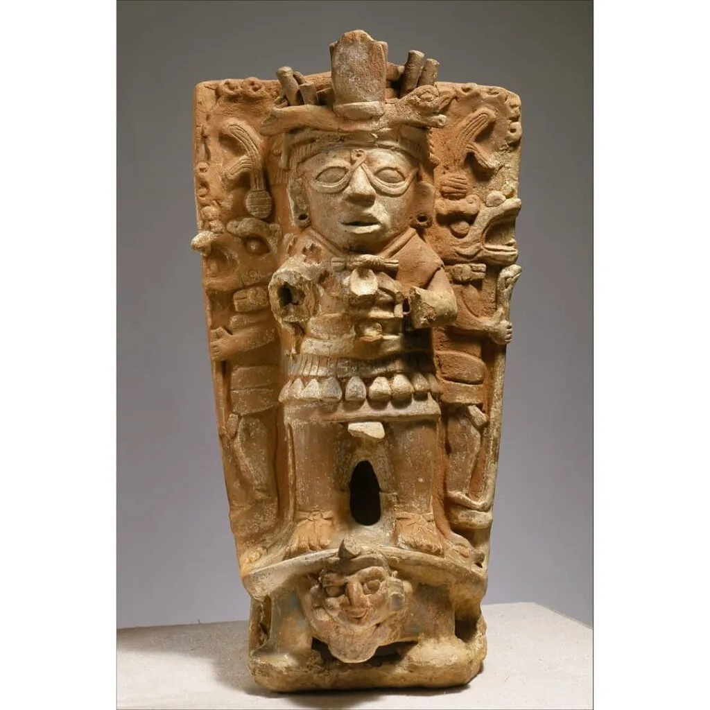 Urna con tapadera que consiste en una base tetrápode decorada con conchas y caracoles elaborada en técnica de modelado y pastillaje y cuatro soportes cilíndricos. La tapadera cónica consiste en la figura modelada del Dios N o un Pahuahtun, emergiendo de un caracol que lleva a manera de sombrero. Las partes visibles son la cabeza, […]