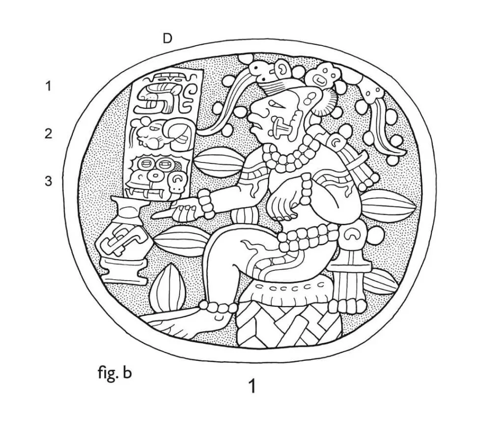 El cuenco en la imagen está decorado con varias imágenes en bajorrelieve, la figura en la publicación tiene tatuajes y le están creciendo vainas de cacao en el cuerpo. Lleva orejeras, un collar de cuentas, pulseras, tobilleras, un cinturón y está sentado sobre un trono tejido cubierto con piel de jaguar.