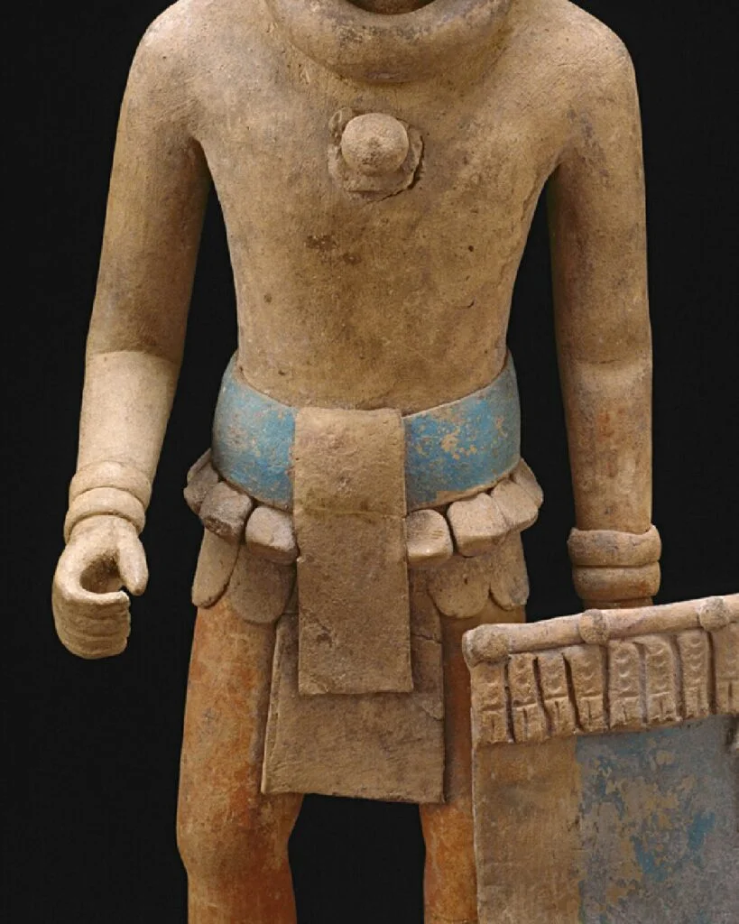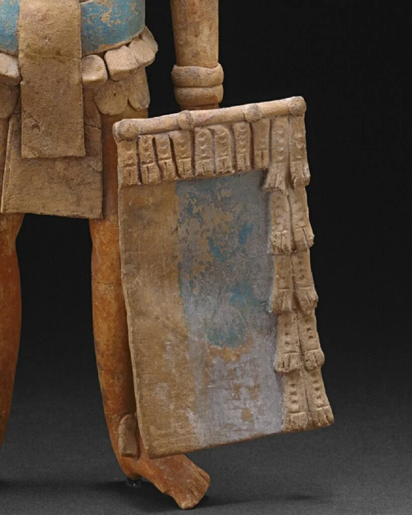 In his left hand he holds a shield rectangular. It is known that this type of shields were folding, and for your details, we can assume that he was covered with feathers. In his right hand he probably had a spear, now lost in time.