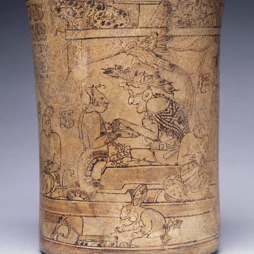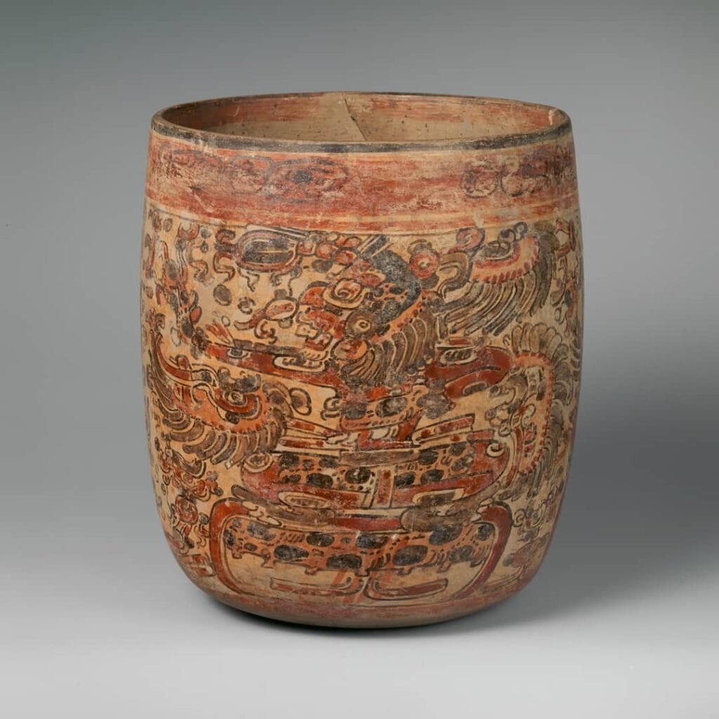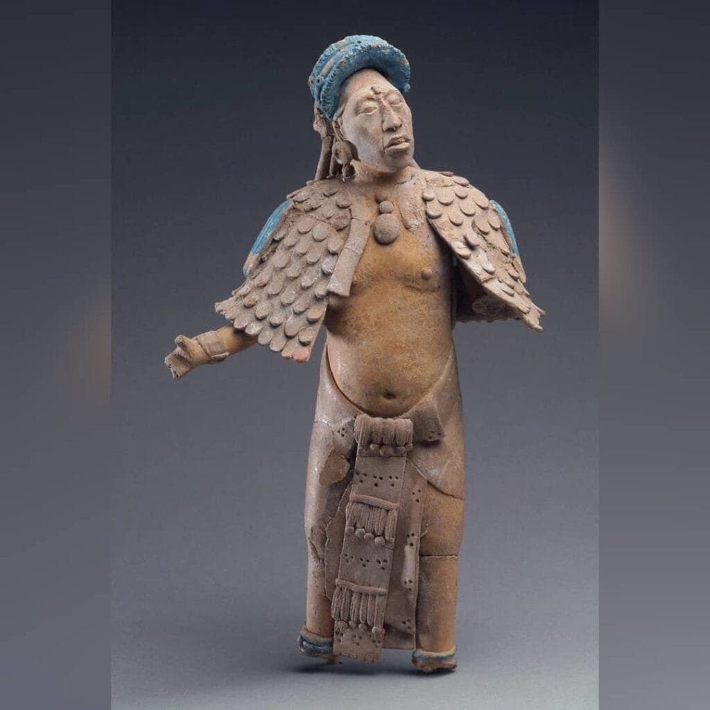 This beautiful figure of ceramics comes from the famous Island of Jaina in Campeche, Mexico. This island was a famous artistic centre which manufactured and exported on a large scale their clay figurines throughout the maya area. The character represented is a layer of feathers, a turban, and several jewels, which gives us an idea […]