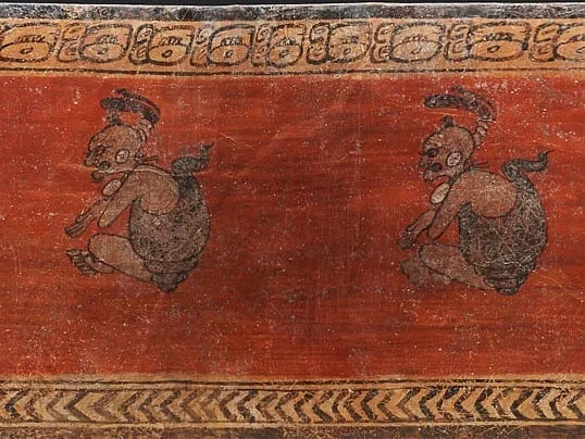Cylindrical glass polychrome decorated with the image of a God N (Pahuahtun) on a red background and framed by bands with designs in chevron. God N features of old, a conch shell on the back and wears headdress, earrings and necklace