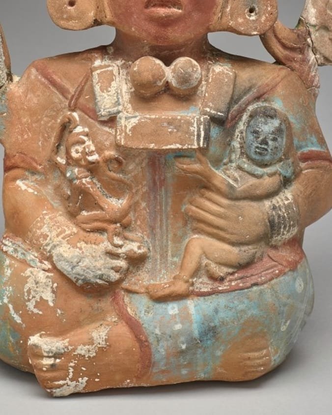 This beautiful figurine depicts a mother maya of the classic period (550-950 AD). Charging in the left side of a newborn baby, and in the right-hand side to a spider monkey (which seems quite playful).