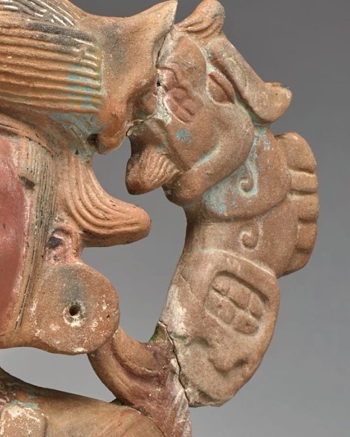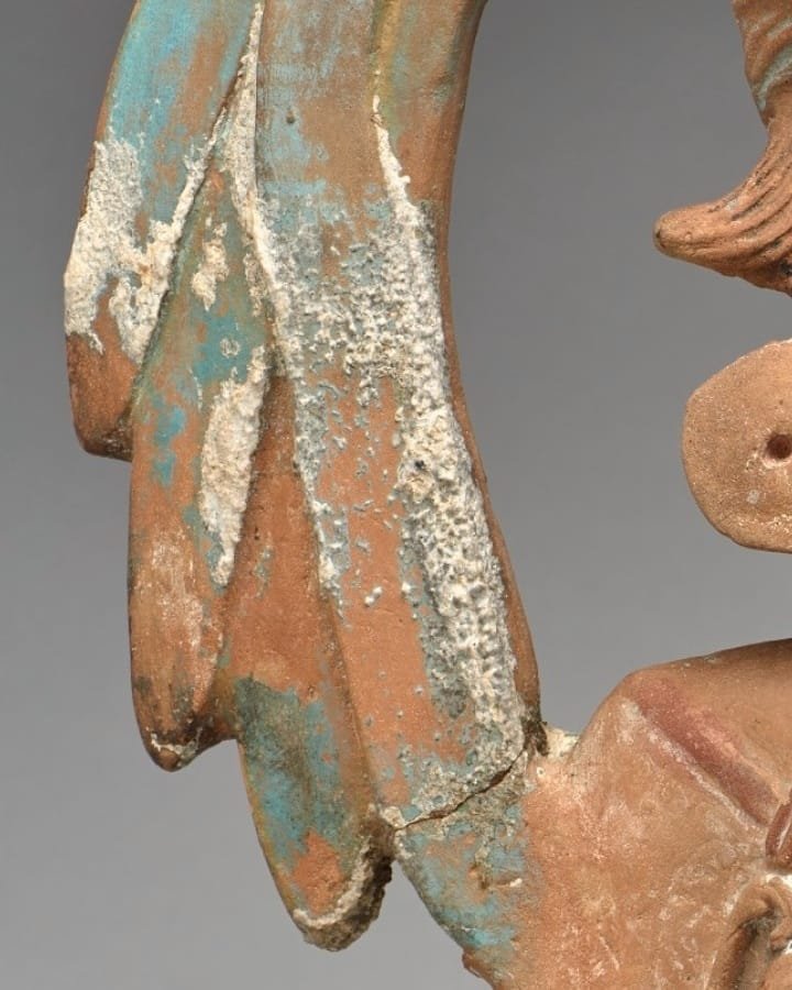 The mother maya has a beautiful touch of blue pens (image 4), and in his left hand carries what appears to be a badge of a feathered serpent (image 5), which can give us the idea that he was associated to some divinity.