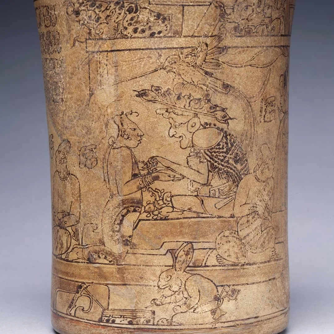 This scene is very similar to a scene from the Popol Vuh, where Junajpú and Xbalanque deceive the gods of Xibalba (the underworld) to the decapiten; and then to be reborn and to overcome them definitely. During this event were helped by a rabbit, hence let’s look at one in this glass.