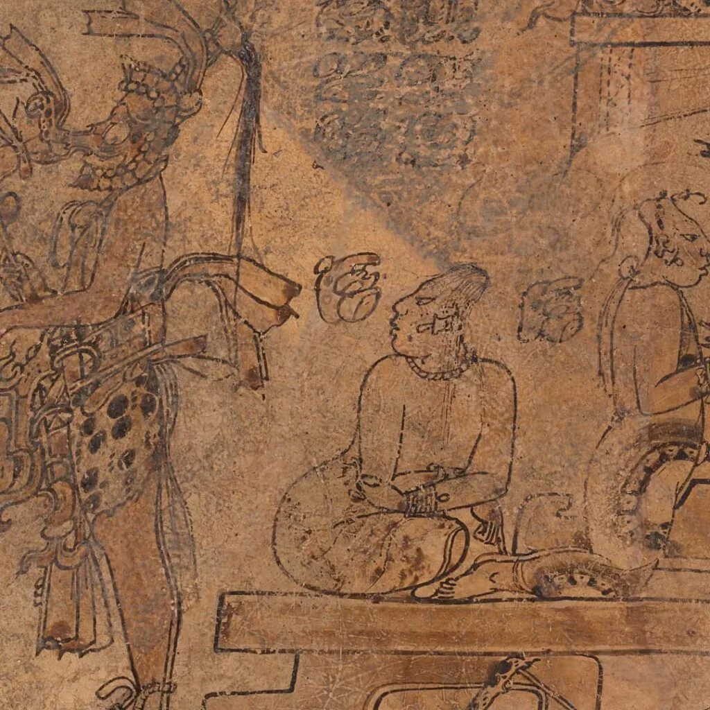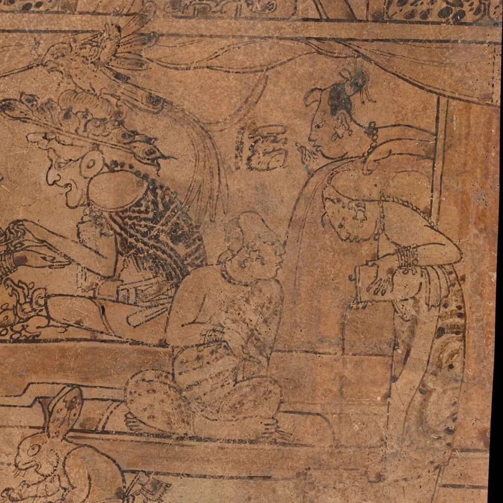It depicts a scene that, though enigmatic, seems to be quite familiar. Sitting on his throne, is the God L, wearing a shawl and a wide-brimmed hat adorned with feathers of owl, is surrounded by concubines and under it there is a rabbit, possibly spying on and taking note of everything that is happening. The God L witnessing what appears to be a sacrifice.