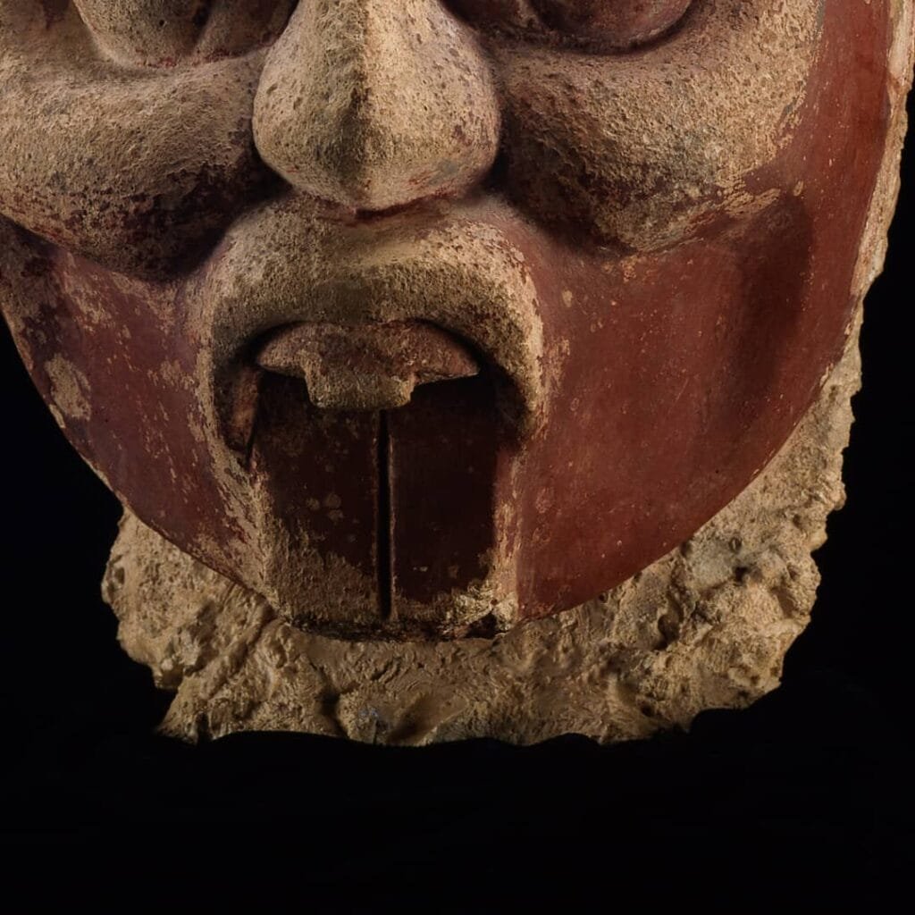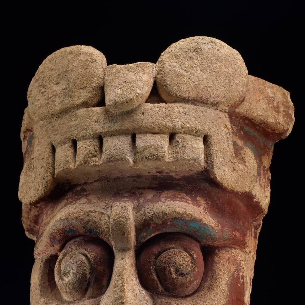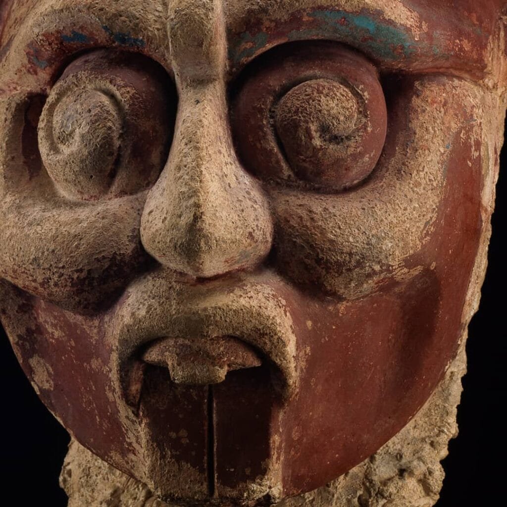 This sculpture is a representation of the sun god. We know that this is God by your traditional eye in a spiral and by his tooth in the shape of a ‘T’.