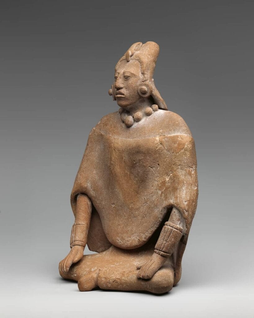 His facial features exemplify the standards of idealized beauty maya. His forehead is high and flat, tilted slightly back. Has almond-shaped eyes, has eyelids thick eyebrows prominent, roman nose high and full lips parted gently.