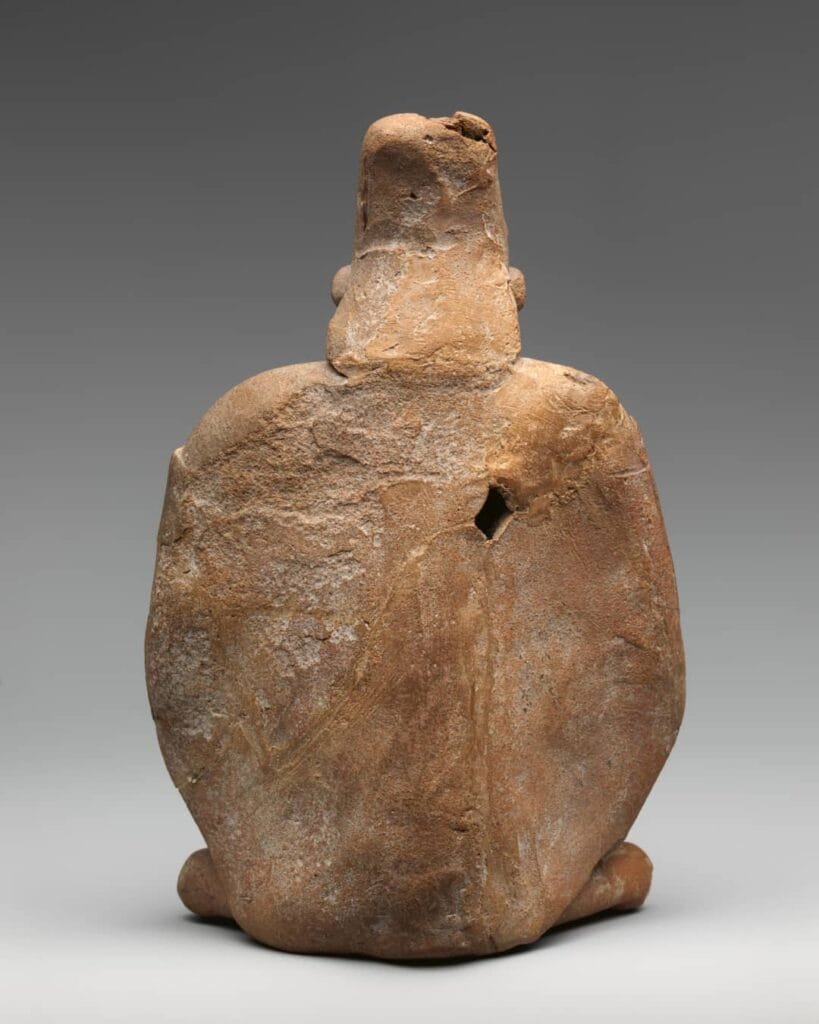 This beautiful piece of classic maya represents a woman with face stoic, dressed according to the custom of his time. The back of the figurine shows a back flat, with openings for a whistle in the right shoulder and the back.