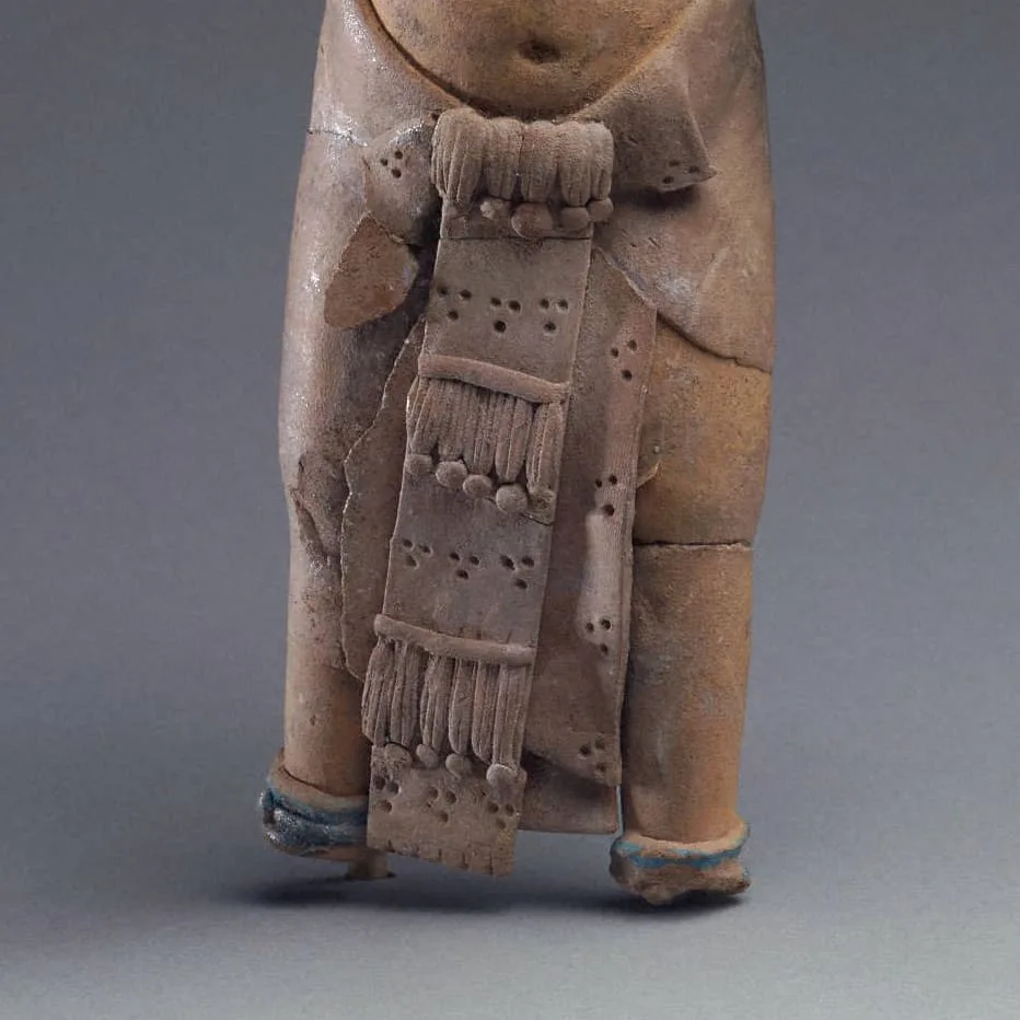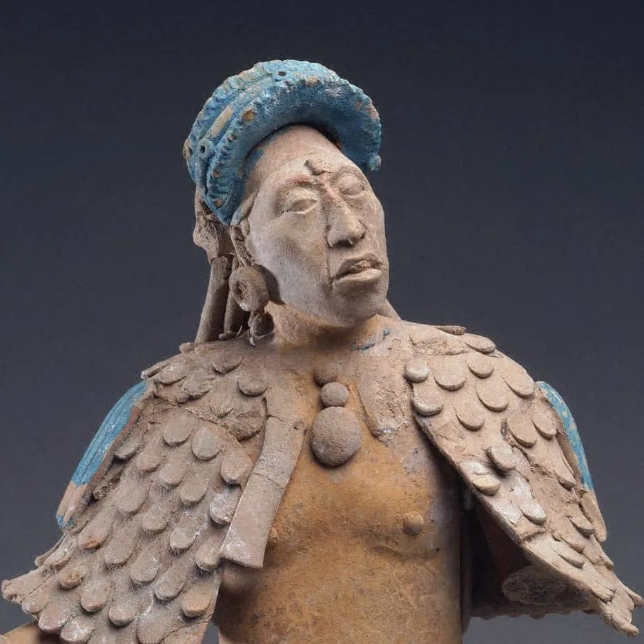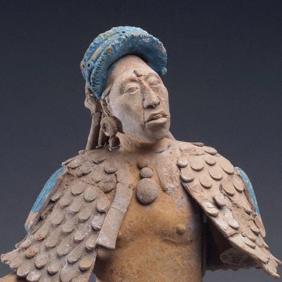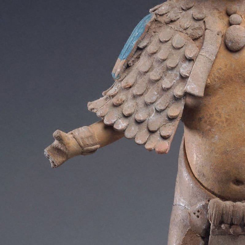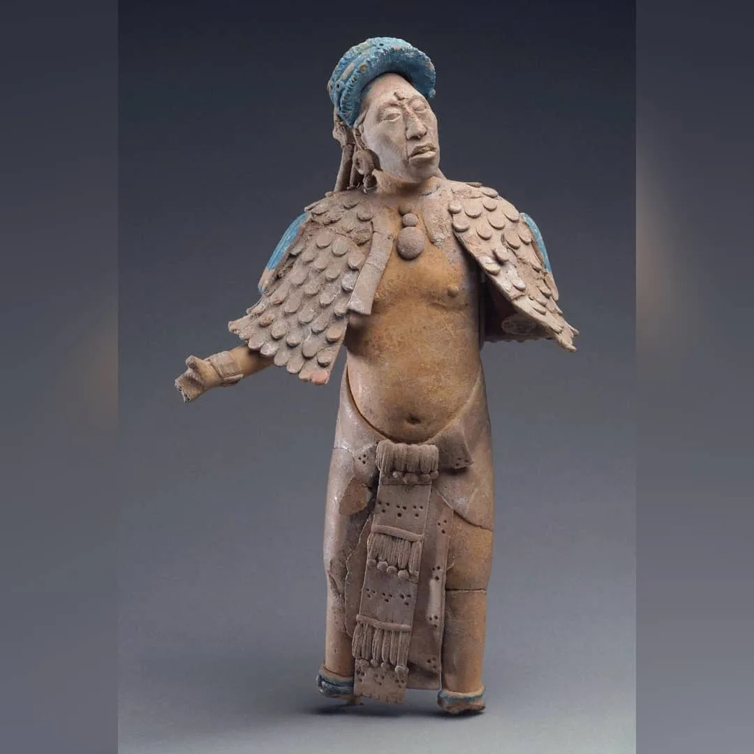 Esta hermosa figura de cerámica proviene de la famosa Isla de Jaina en Campeche, México. Esta isla fue un famoso centro artístico que fabricaba y exportaba a gran escala sus figurillas de arcilla por toda el área maya.