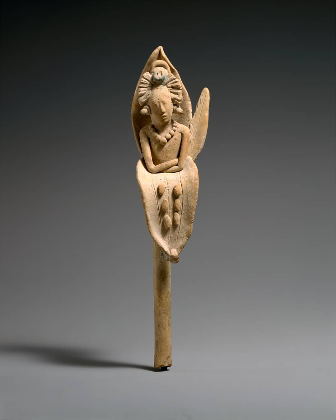 Los antebrazos del dios están recostados en la mazorca.